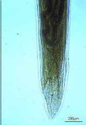 c) Larva: as larvas rabditóides de A. duodenale e de N. americanus são indistinguíveis, por isso as designamos como larvas de Ancilostomídeos. Estas se diferenciam das larvas de Strongyloides por apresentarem vestíbulo bucal longo e primórdio genital pouco nítido. A larva filarióide de Ancilostomídeo possui cauda pontiaguda, com bainha e esôfago ocupando 1/3 do seu corpo.
